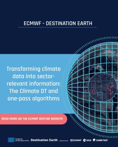 Το Climate Change Adaptation Digital Twin (Climate DT), μέρος της πρωτοβουλίας Destination Earth της Ευρωπαϊκής Επιτροπής, προσφέρει προβλέψεις για το κλίμα δεκαετίες μπροστά, με λεπτομέρεια σε κλίμακα χιλιομέτρων, εντοπίζοντας επιπτώσεις ακραίων φαινομένων και της κλιματικής αλλαγής. Παράγοντας τεράστιους όγκους δεδομένων, το Climate DT εφαρμόζει τις λεγόμενες one-pass algorithms, που μετατρέπουν τα ακατέργαστα δεδομένα σε στοχευμένες πληροφορίες για συγκεκριμένους τομείς, ενώ οι προσομοιώσεις τρέχουν. Αυτή η μέθοδος μειώνει την ανάγκη για αποθήκευση ολόκληρων συνόλων δεδομένων και παρέχει αποτελέσματα «on the fly», όπως στατιστικά για την ταχύτητα ανέμου για την ενέργεια ή για έντονες βροχοπτώσεις και πλημμύρες για τη διαχείριση υδάτων και υποδομών.