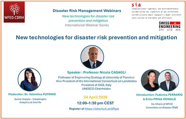 Το World Federation of Engineering Organizations (WFEO), μέσα από την Επιτροπή του για τη Διαχείριση Κινδύνων Καταστροφών (Committee on Disaster Risk Management – CDRM), σε συνεργασία με το Swiss Society of Engineers and Architects (SIA), διοργανώνει ένα νέο διεθνές webinar με θέμα «New technologies for disaster risk prevention and mitigation».