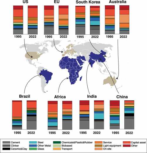 Από το 1995 έως το 2022, περιοχές όπως η Αφρική, η Βραζιλία και η Κίνα παρουσίασαν σημαντική αύξηση στη χρήση “μη βιώσιμων” δομικών υλικών (όπως τσιμέντο, κλίνκερ, χάλυβας και άλλα μέταλλα). Στην Κίνα, η συμμετοχή αυτών των υλικών στο αποτύπωμα άνθρακα των κατασκευών ανέβηκε από 43% το 1995 σε 73% το 2022, ενώ η χρήση βιολογικών υλικών, όπως ξύλο και άχυρο, μειώθηκε από 4% σε μόλις 0,5%.