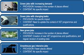 Οι «πράσινες» θέσεις εργασίας περιλαμβάνουν τόσο νέες υψηλής εξειδίκευσης θέσεις όσο και ήδη υπάρχουσες που εξελίσσονται λόγω της πράσινης μετάβασης. Κάποιες είναι εντελώς νέες και συνδέονται με νέες τεχνολογίες, απαιτώντας υψηλές δεξιότητες και συνήθως τριτοβάθμια ή τεχνική μετα-δευτεροβάθμια εκπαίδευση. Άλλες είναι θέσεις μεσαίου επιπέδου που αλλάζουν τα καθήκοντά τους ή αυξάνεται η ζήτηση για αυτές – πολλές από αυτές καλύπτονται από απόφοιτους VET. Παρά το γεγονός ότι οι θέσεις αυτές συχνά προσφέρουν μέτριες αμοιβές, σε ορισμένες χώρες παραμένουν σχετικά χαμηλά αμειβόμενες, κάτι που μπορεί να αποθαρρύνει υποψήφιους εργαζόμενους.